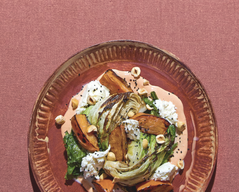 Geroosterde spitskool met komkommer en geitenkaasraita